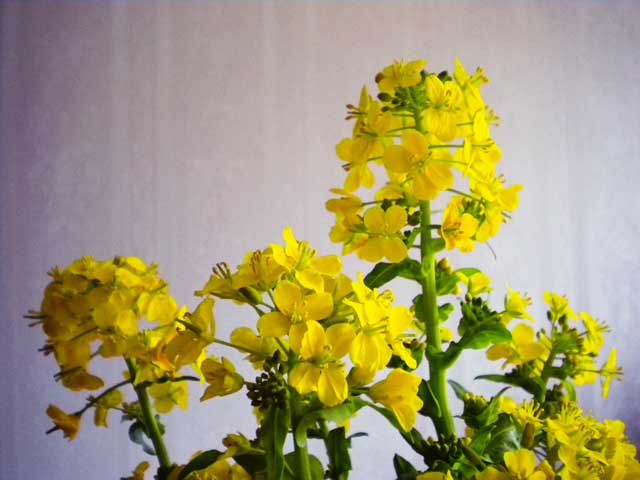 お恥ずかしい話ですが、冬菜を茹でずに置きっぱなしにしていたら、花が咲いてしまいました。瓶に入れて食卓に飾ることにしたのでその時撮影したものです。