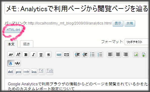 先ずは、MTの管理画面にHTML-lintのボタンを追加したところです。alt-templateを用いて管理画面の変更をおこなっています。