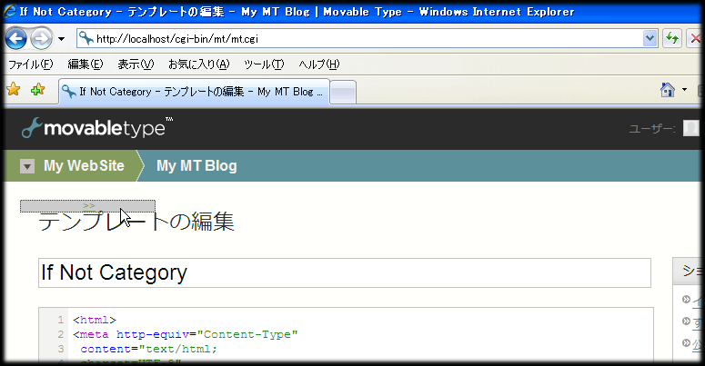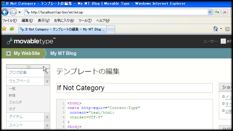 .wide_view_menu{ clear:left !important; position:absolute; left:-170px;!important } .wide_view_content{ width: 115%!important; clear:left!important; position:relative!important; left:0!important; } #toggle_view{ display: block; position:relative; padding-left: 4px; left: 0px; width: 145px; text-align : center; background-color:#ccc; cursor: default; } #toggle_view:hover { background-color: #eee; } - mt/tmpl/cms/ のedit_template.tmplファイルを開きます