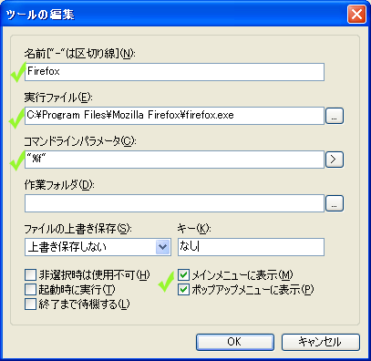 通常は上記の設定だけで十分でしょう。ここでは、ツールという機能にFirefoxを登録する方法をです。このやりかたですとFirefoxのパスを他のブラウザに変えればいいのですから、複数のブラウザ設定にも対応できます。