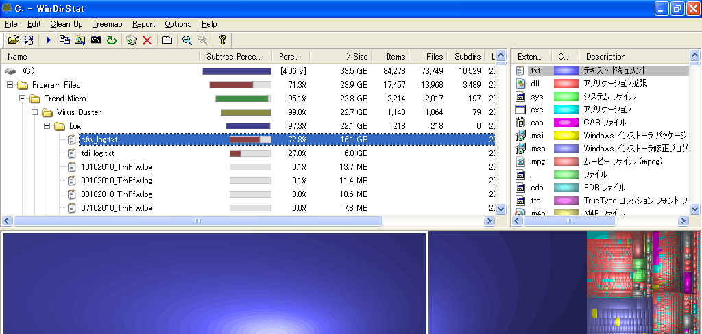 WinDirStatのようなソフトを知ったというのが今回の収穫でしょうかねえ。「WinDirStat」の使い方 - パソコントラブルと自己解決を参考にしてポータブルのほうを使いました。