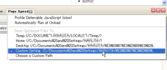 保存場所をTempに戻すと先ほどのメニューからcustom pathが消えます。またcustom settingで指定したフォルダが削除してある場合はその箇所に指定したフォルダが作成されて保存されています。(Page Speed Tempというフォルダをフォルダごとごみ箱に移動した場合、新たにデスクトップにPage Speed Tempが作られその配下にpage-speedフォルダが作成されている)