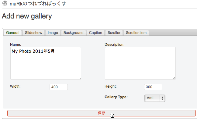 ギャラリーの名前と説明とサイズ、横と縦のピクセル値(通常の写真のサイズで4:3の割合です)、ギャラリーのタイプ(ドロップダウンメニューでいくつか選択します。ここでは初期値のArai)を設定しておきます。