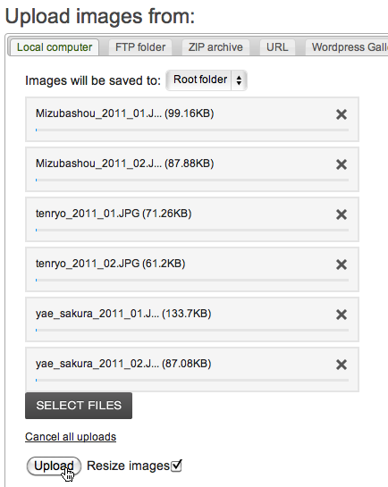 複数選択が可能です。アップロードしたいファイルを選択します。サイズの大きな画像は、一度にアップロードしないほうがいいかもしれません。