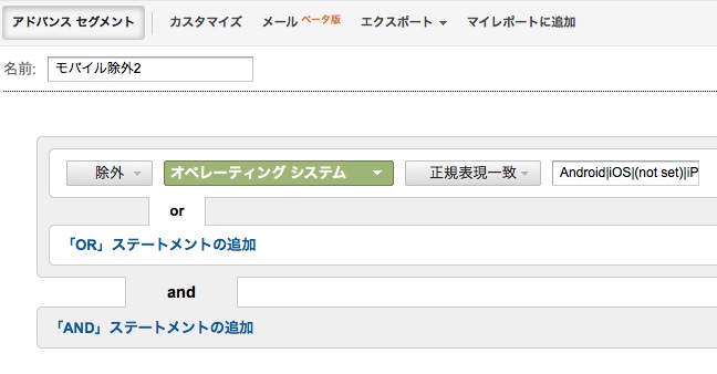- メモ:GoogleAnalytics:モバイルからのトラフィックを除外するカスタムセグメント 08日