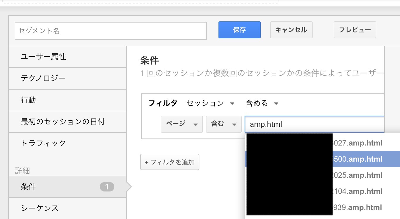 - 条件は「含む」で 「amp.html」(AMPページで使用しているURLに含まれてる文字列。人によって条件は違います)を入力。候補が絞り込み表示されて、右ペインにフィルターされてる結果がでます
