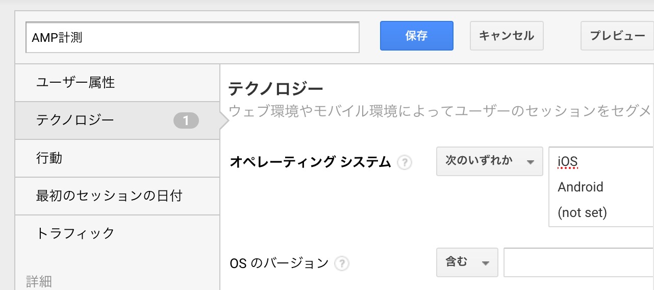 - 左の「テクノロジー」タブを押します。「オペレーティング システム」の項目に 「iOS」「Android」「(not set)」(これは任意)を設定します。(改行で内容の区切りになることに注意します)