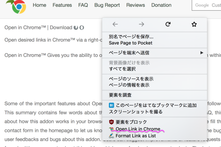 これでブラウザーで、コンテキストメニューを開き、Open Link in Chrome を選べば、Google Chrome が起動して、ページを開きます。